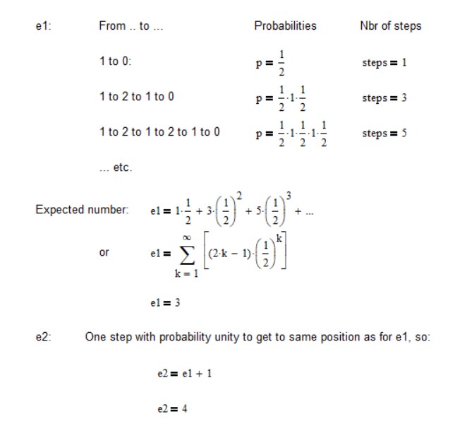 "Anty the ant is on the real number line, and Anty's goal is to get to 0. If Anty is at 1, then on the next step, Anty moves to either 0 or 2 with equal probability. If Anty is at 2, then on the next step, Anty always moves to 1. Let e1 be expected number of steps Anty takes to get to 0, given that Anty starts at the point 1. Similarly, let e2 be expected number of steps Anty takes to get to 0, given that Anty starts at the point 2. "