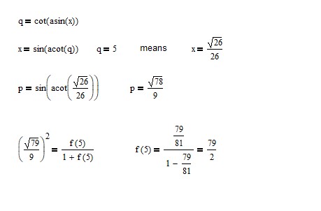 If p = sin(arccot(x)), q = cot(arcsin(x)), and p^2 = f(q)/(1 + f(q)), then find f(5).