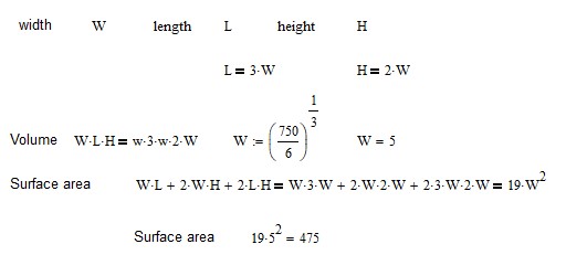 "A rectangular box having no top is three times as long as it is wide, and two times as tall as it is wide. If its volume is 750, what is its surface area?"