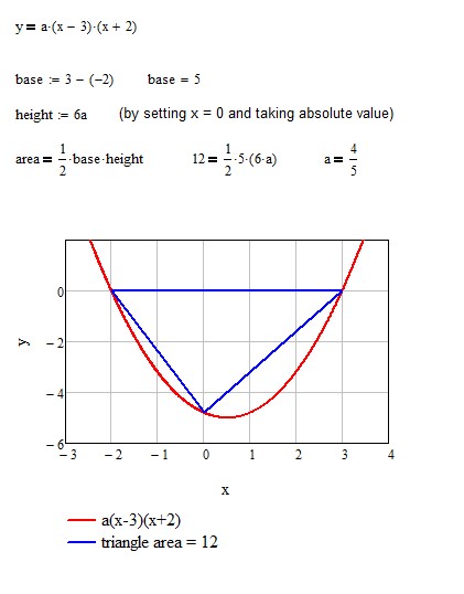 "The area of the triangle formed by points of intersection of parabola y=a(x-3)(x+2) with the coordinate axes is 12. Find a if it is known that parabola opens upward."