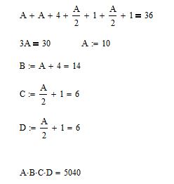 Four positive integers A, B, C and D have a sum of 36. If A + 2 = B - 2 = C*2 = D*2, what is the value of the product ABCD?