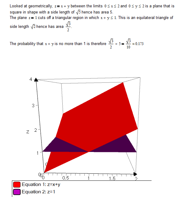 "Two real numbers are chosen at random between 0 and 2. What is the probability that their sum is no more than 1?"