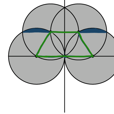 The area of the Venn diagram on top is \(16 \pi - {16 \over 3} \pi + 4\sqrt3\) (\(16 \pi \) is the area of the 2 semi-circles, and \(16- 4\sqrt3\) is the area of the overlap.