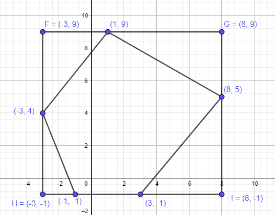 Subtract areas of the right triangles (1/2) [ (4*5 ) + (5*2) + (6*5) + (7*4) ] = 44