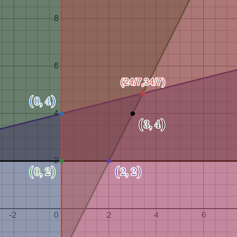 The polygon is bounded by (0,2) , (0,4), (2,2) and the point determined by the intersection of the lines