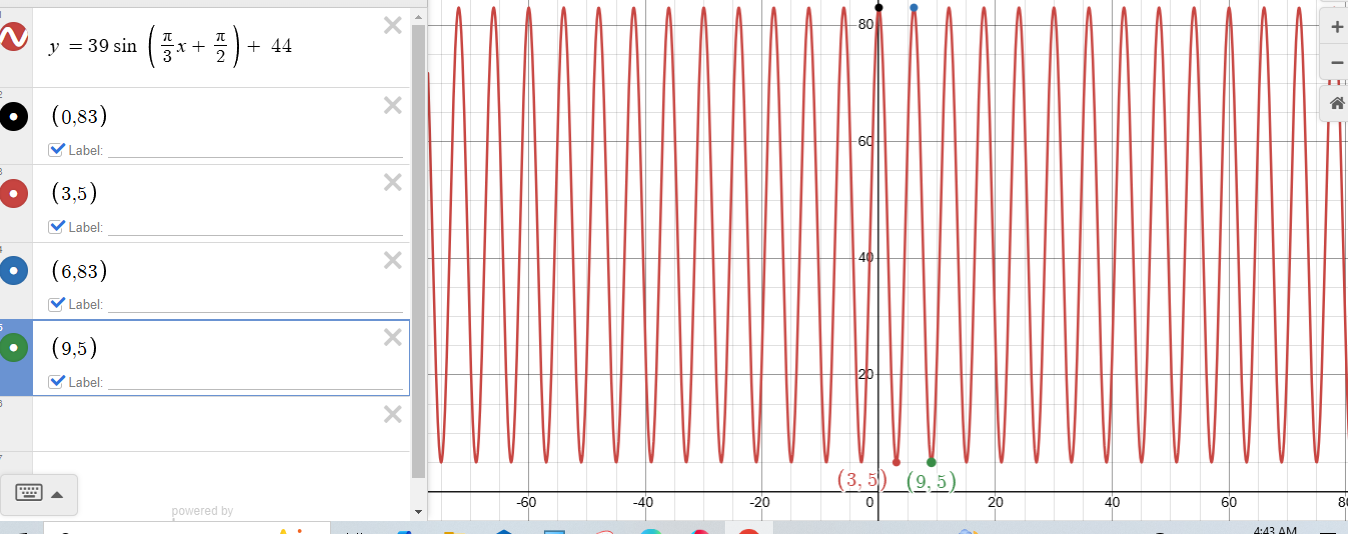 y = 39 sin (pi/3 * x + pi/2) + 44