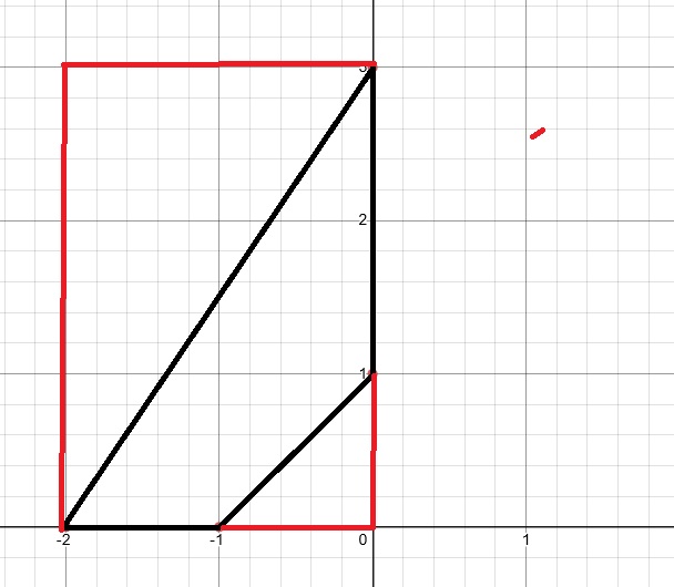 then, I would calculate the entire rectangular area..... then subtract the two areas of the red right triangles for a final result: