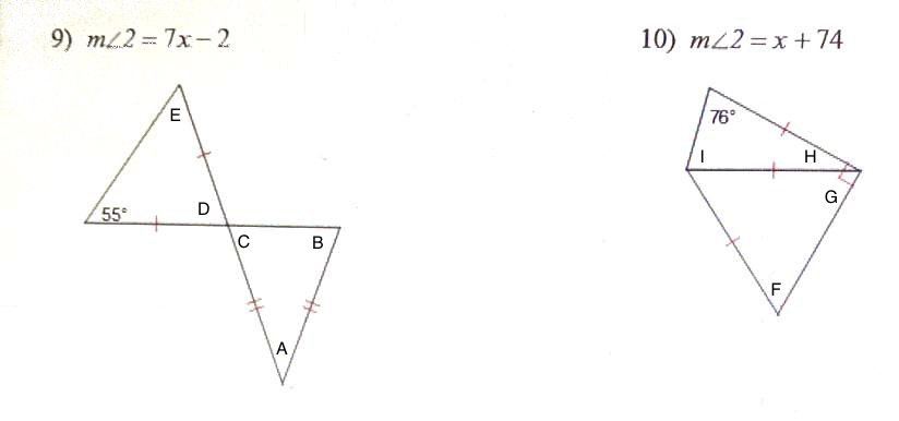 m∠E = 55° because it is the other base angle of an isosceles triangle.