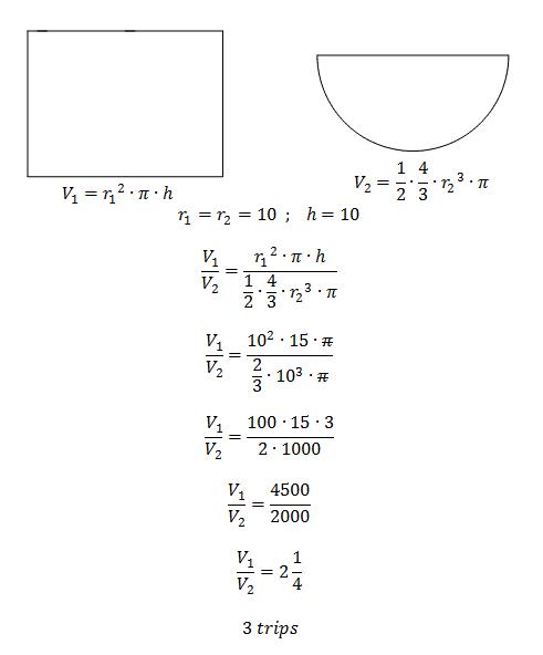 Brad has a cylindrical barrel with radius 10 inches and height 15 inches. He wants to fill it from a well, using a bucket in the shape of a hemisphere with a radius of 10 inches. How many trips must Brad make to the well in order to fill the barrel?