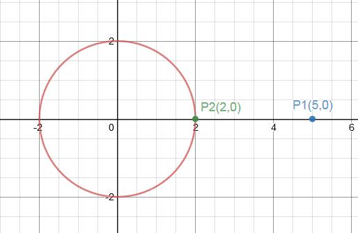 Find the point on the curve x^2 + y^2 = 4 that is closest to (5,0).