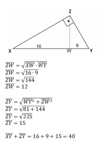 In the diagram, ZW and XY are perpendicular, XW = 16, and WY = 9. Find ZY + XY.