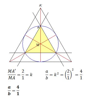 Let a be the area of an equilateral triangle, and let b be the area of another equilateral triangle inscribed in the incircle of the first triangle. What is a/b?