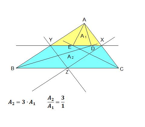 In triangle ABC, perpendiculars from A to the bisectors of anlge B and angle C meet the bisectors in D and E, respectively. The line through D and E intersects AC at X and AB at Y. Find the ratio of the area of XYBC to the area of ABC.