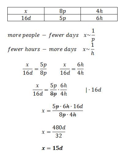 To complete a task in 16 days a company needs 5 people each working in 6 hours per day The company decides to have 8 people each working in 4 hours per day Assuming that each person works at the same rate,how many days will the task take to complete