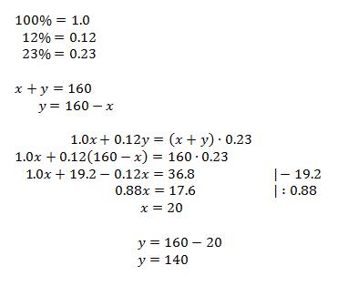 A chef plans to mix 100% vinegar with Italian dressing. The Italian dressing contains 12% vinegar. The chef wants to make 160 milliliters of a mixture that contains 23% vinegar. How much vinegar and how much Italian dressing should she use?