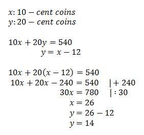 Jun Wei has 12 more 10-cent coins than 20-cent coins. The total value of all his coins is $5.40. Find the total number of coins he has.