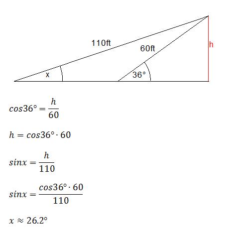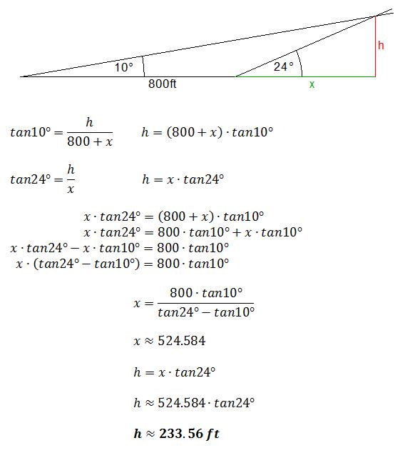 Charles lives in a tall apartment building. He looks out his window and spots a car on the road that runs straight toward his building. His angle of depression to the car is 24°. Charles looks farther down the road and spots a dump truck. He estimates that the car is 800 feet in front of the dump truck. His angle of depression to the dump truck is 10°. How far above the ground is Charles's line of sight?