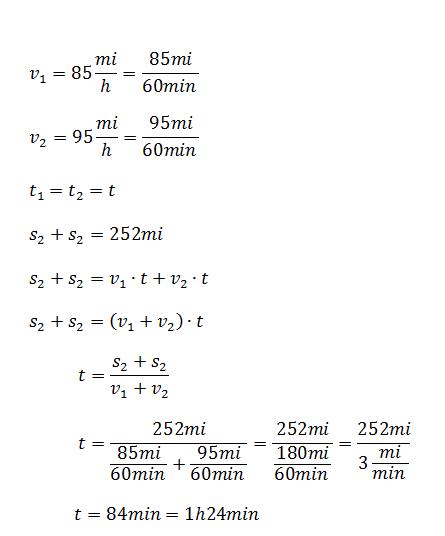 Two trains leave the station at the same time, one heading west and the other east. The westbound train travels at 85 miles per hour. The eastbound train travels at 95 miles per hour. How long will it take for the two trains to be 252 miles apart? Do not do any rounding.