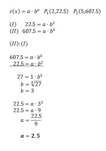 The graph of the function c(x) goes through the points (2,22.5) and (5,607.5). If this function can be written in the form c(x)=a(b)^x, what is the value of a in the equation?