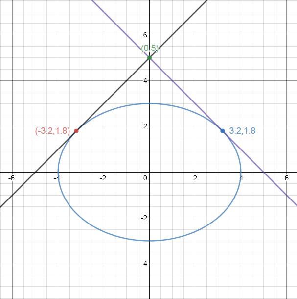 A line whose y intercept is (0, 5) intersects the ellipse 9x2+16y2 = 144 . Find all possible slopes of this line, express your answer in interval notation.